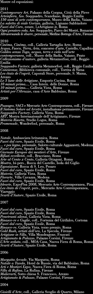 Il percorso di Andrea Mercedes Melcco si è snodato attraverso tante differenti esperienze: finché un inverno è avvenuto su una spiaggia il suo incontro con i legni piccoli e grandi che il mare elabora e abbandona incessantemente.Lo sguardo di Andrea ne riscopre le tracce di vita e le riesprime nei LEGNI DI MARE: racconti e forme realizzati con l'oro, le perle o le pietre preziose. Sono emozioni in forma di spilla, da tenere con sé, forse da indossare; sono gioielli d’arredo da tenere vicino, come sogni da ricordare, o amuleti.Su uno di questi legni spunta il primo PETER, figurina in oro su un frammento, forse, di palma. PETER cresce il proprio valore mitico e simbolico nel mondo artistico di Andrea: e sente il bisogno di interpretare nuove dimensioni.Nascono così LES ETATS DE L’ESPRIT, sagome a grandezza naturale, presenze nere di forte impatto visivo e di altrettanto forte potere evocativo, pezzi unici che colgono i gesti, le emozioni e i pensieri di ognuno di noi. Non ritratti, non fotografie: piuttosto l’essenza vera delle persone, quella che si rivela solo controluce, solo a occhi chiusi. PETER prosegue il proprio cammino e porta per mano Andrea verso nuove esperienze. Si trasforma ancora e si racconta in una serie di nere piccole figurine, singole o composte in “teatrini”, dove vivono e danzano su legno di mare, ferro o pietra - sempre con la fiamma dell’oro.